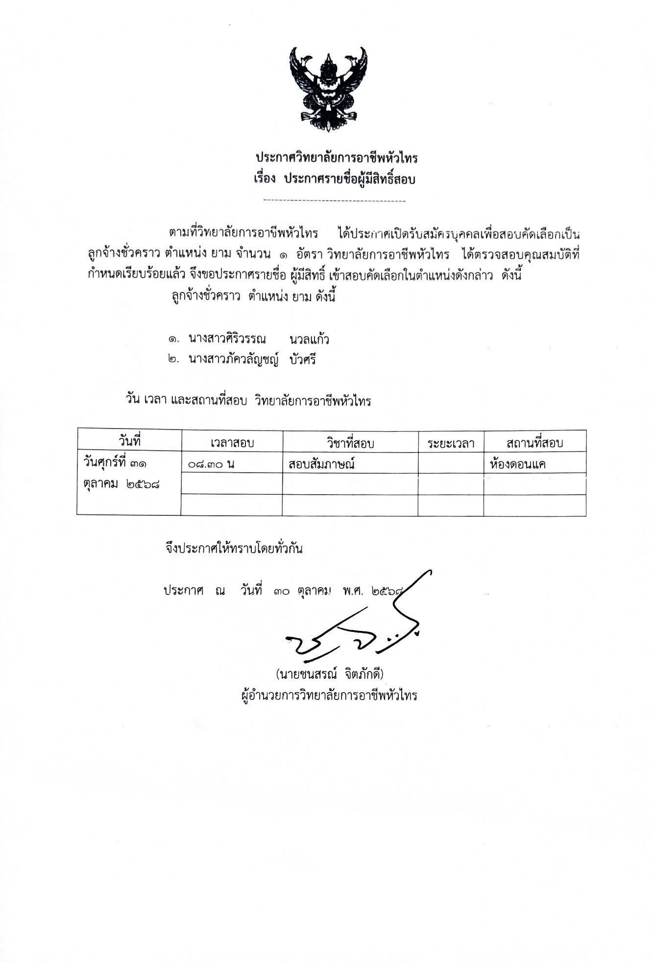ประกาศรายชื่อผู้มีสิทธิ์สอบตำแหน่งลูกจ้างชั่วคราว ยาม วิทยาลัยการอาชีพหัวไทร