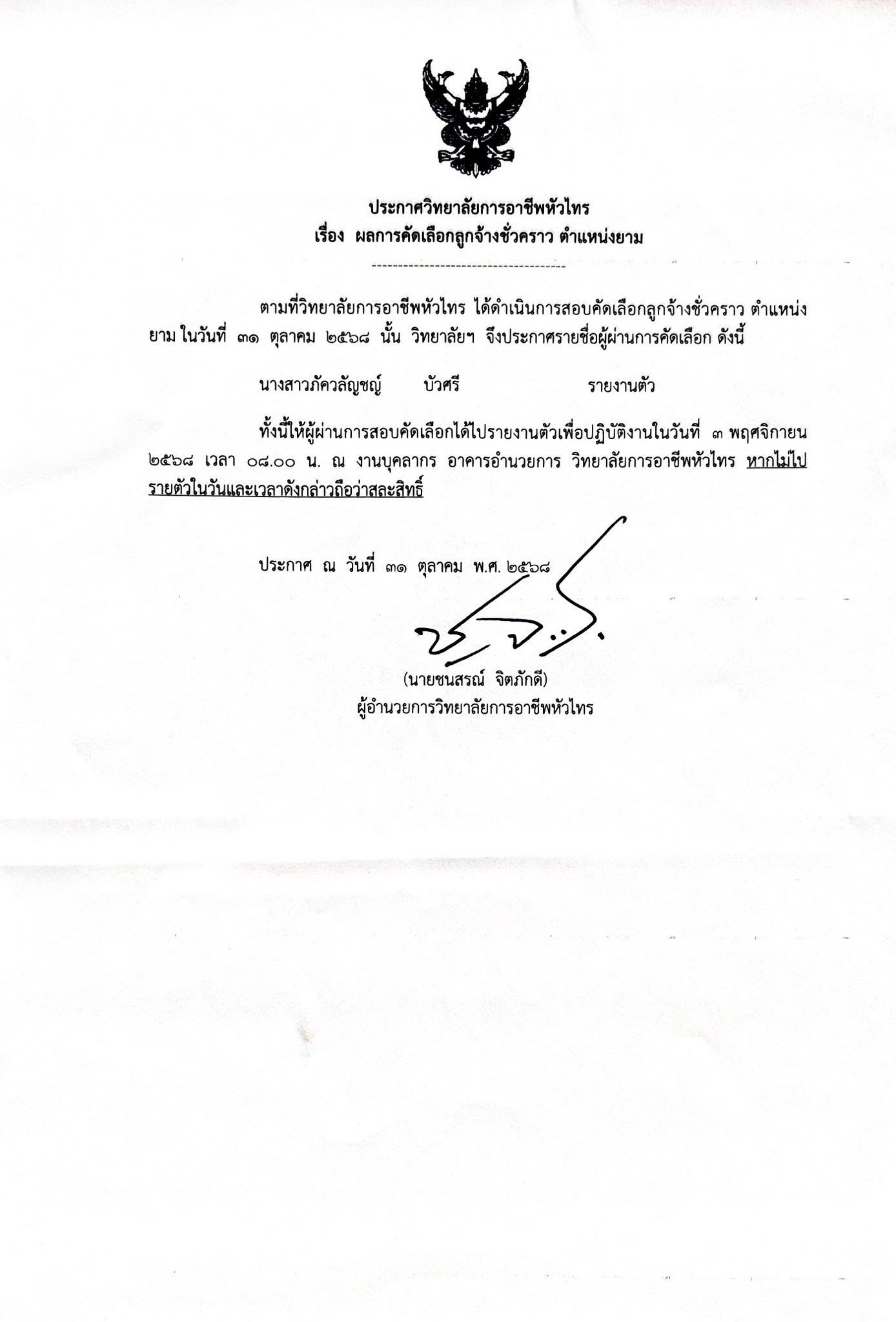 ประกาศวิทยาลัยการอาชีพหัวไทร เรื่อง ผลการคัดเลือกลูกจ้างชั่วคราว ตำแหน่งยาม