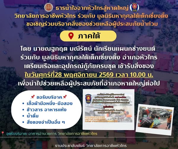 วิทยาลัยการอาชีพหัวไทร ร่วมกับ มูลนิธิมหากุศลใต้เต็กเซี่ยงตึ๊ง อำเภอหัวไทรขอเชิญร่วมบริจาคสิ่งของช่วยเหลือผู้ประสบภัยน้ำท่วม
