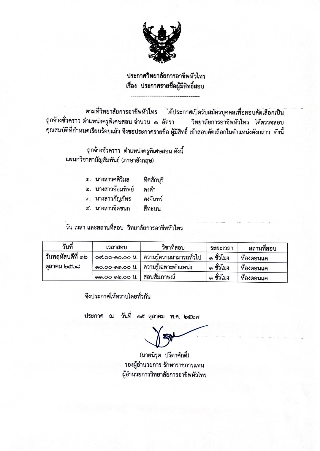 ประกาศรายชื่อผู้มีสิทธิ์สอบ ตำแหน่งครูพิเศษสอน แผนกวิชาบริหารธุรกิจ (สาขาวิชาการบัญชี)