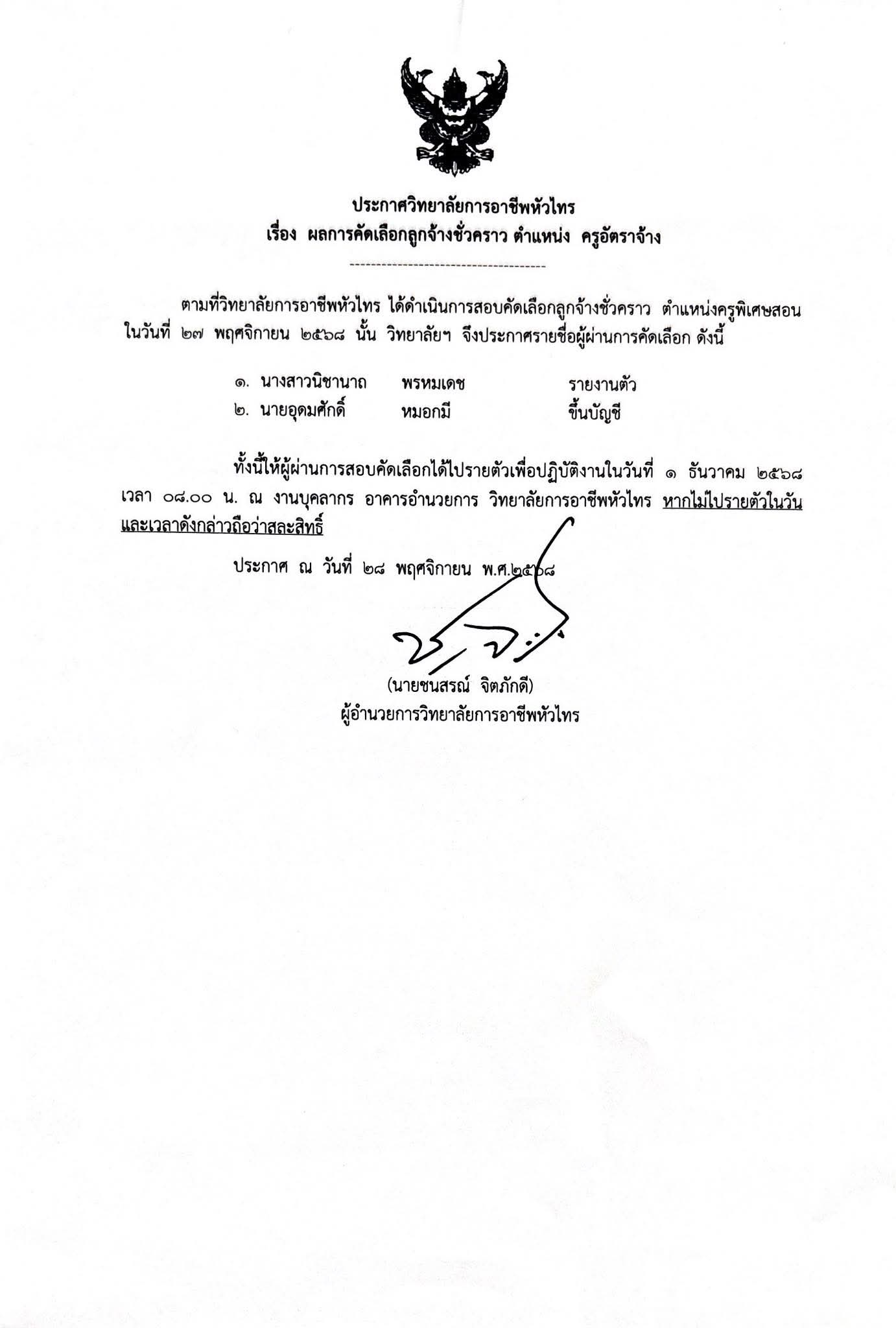 ประกาศ เรื่อง ผลการคัดเลือกลูกจ้างชั่วคราว ตำแหน่ง ครูอัตราจ้าง ดังรายละเอียดที่แนบ